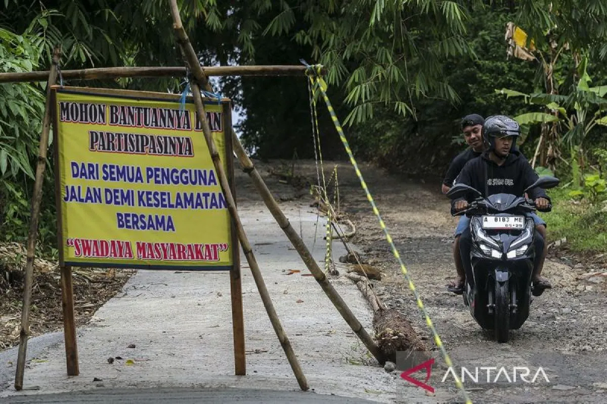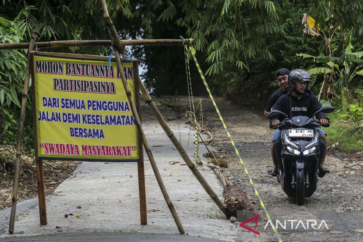 Pengendara sepeda motor melintasi jalan rusak di Kelurahan Kadomas, Kabupaten Pandeglang, Banten, Sabtu (11/1/2025). Warga setempat berinisiatif secara swadaya memperbaiki jalan penghubung antarkabupaten Pandeglang dan Lebak yang rusak selama sekitar 25 tahun itu tanpa adanya bantuan dari pemerintah setempat.