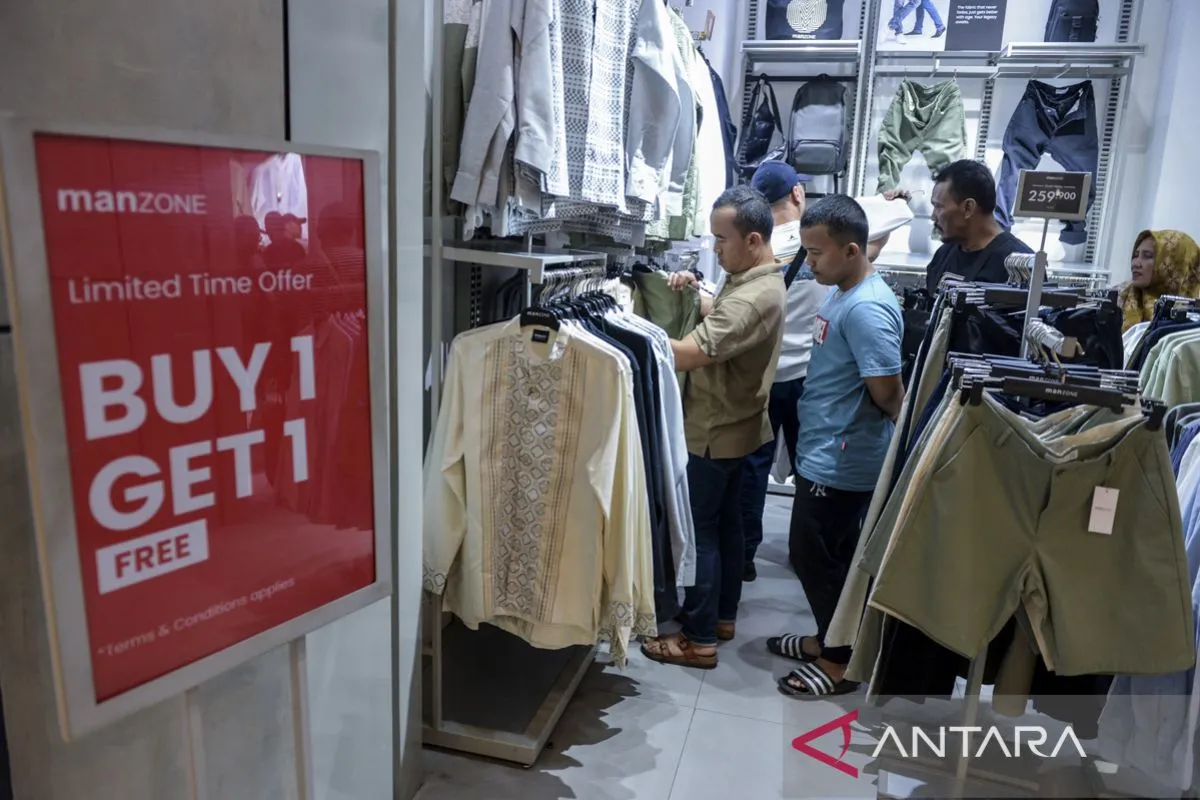 Pengunjung memilih pakaian di TangCity Mall, Kota Tangerang, Banten, Minggu (23/3/2025). Menjelang Hari Raya Idul Fitri 1446 Hijriah, sejumlah pusat perbelanjaan mulai menawarkan diskon atau potongan harga barang hingga 50 persen untuk menyambut animo masyarakat dalam berbelanja memenuhi kebutuhan Lebaran.