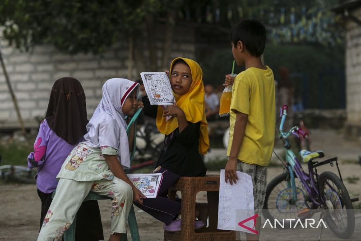 Empat anak berbincang di sela mengikuti kegiatan belajar mewarnai di Kampung Begog, Singarajan, Pontang, Kabupaten Serang, Banten, Sabtu (17/5/2025). Ruang belajar alternatif bernama Sudut Desa Literasi yang diinisiasi oleh pemuda kampung setempat dan kelompok mahasiswa tersebut digelar setiap Sabtu sore dengan tujuan memberantas buta huruf sekaligus mencerdaskan anak-anak desa.