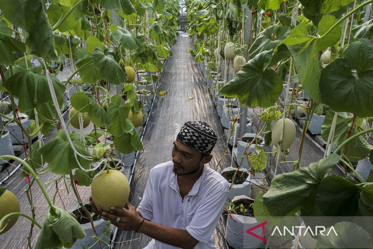 Petani memeriksa buah melon di kebun wisata petik melon Agro Media Garden, Waringinkurung, Kabupaten Serang, Banten, Sabtu (31/5/2025). Kebun petik yang ditanam pada bangunan rumah kaca atau greenhouse itu memiliki sekitar 1.500 pohon dengan empat jenis melon impor yang dikelola menjadi tempat agrowisata sehingga pengunjung dapat memetik buah melon sendiri dengan harga Rp40 ribu hingga Rp45 ribu per kilogram.