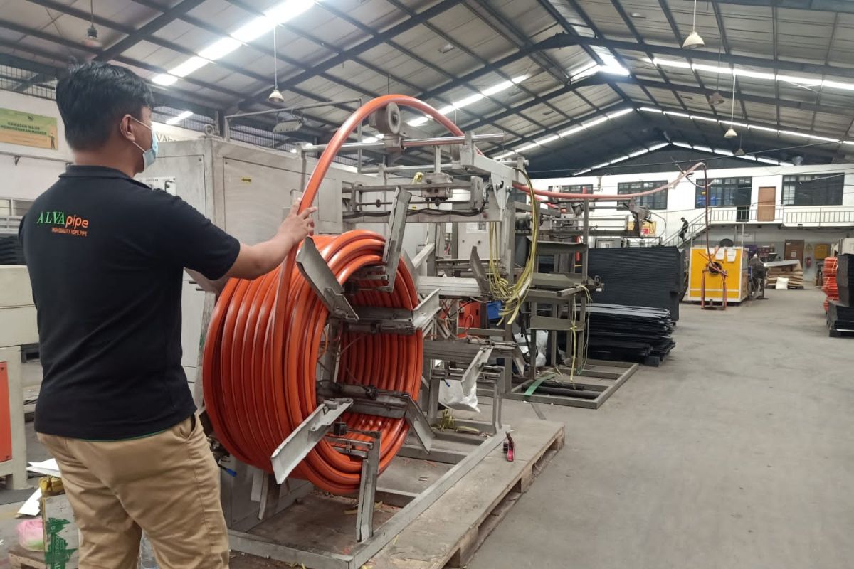 Petugas saat produk ALVApipe yang terdiri dari pipa, selang, dan profil berbahan HDPE atau High-Density Polyethylene dengan teknologi baru. ANTARA/Azmi