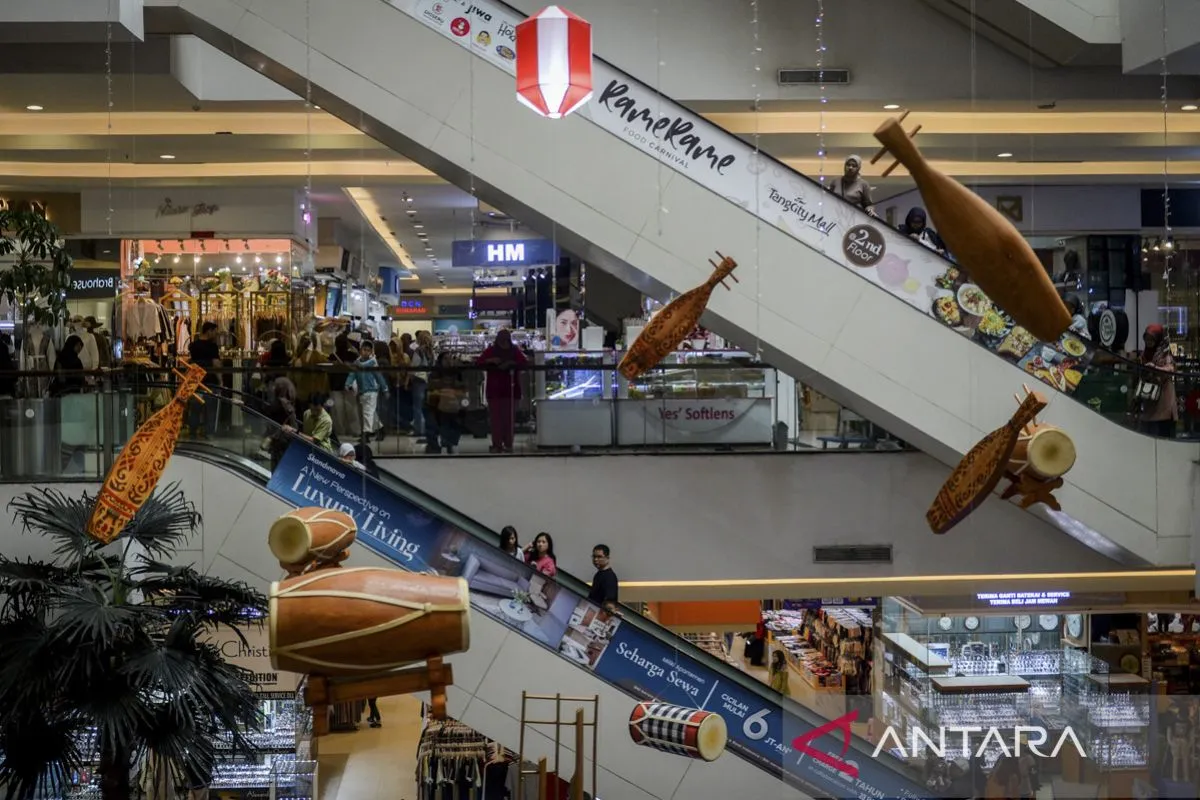 Pengunjung menaiki eskalator di Tangcity Mall, Kota Tangerang, Banten, Senin (8/9/2025). Gubernur Banten Andra Soni mengatakan pusat perbelanjaan menyumbang 12,15 persen terhadap Produk Domestik Regional Bruto (PDRB) Banten atau posisi ketiga setelah industri pengolahan.
