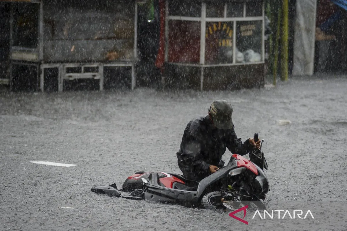 Warga mendirikan sepeda motor yang jatuh akibat terhempas banjir di Kutabumi, Kabupaten Tangerang, Banten, Kamis (11/9/2025). Banjir setinggi 20 - 50 cm yang kerap terjadi ketika hujan deras diakibatkan buruknya kualitas drainase di kawasan tersebut.