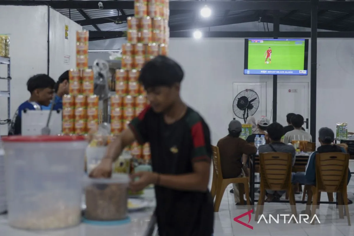 Warga menyaksikan pertandingan Timnas Indonesia melawan Timnas Arab Saudi pada laga pertama Grup B putaran keempat Kualifikasi Piala Dunia 2026 zona Asia di Warkop Agam Legenda, Pasar Kemis, Kabupaten Tangerang, Banten, Kamis (9/10/2025). Pengelola warung kopi tersebut menggelar nonton bareng (nobar) untuk warga sebagai bentuk dukungan kepada Timnas Indonesia.