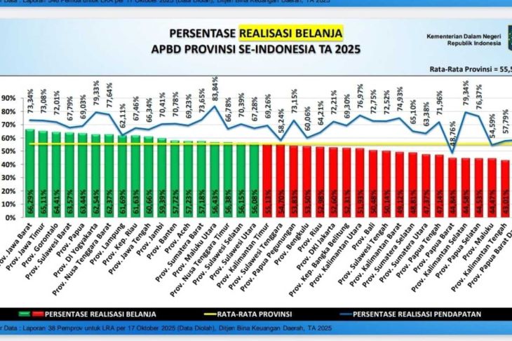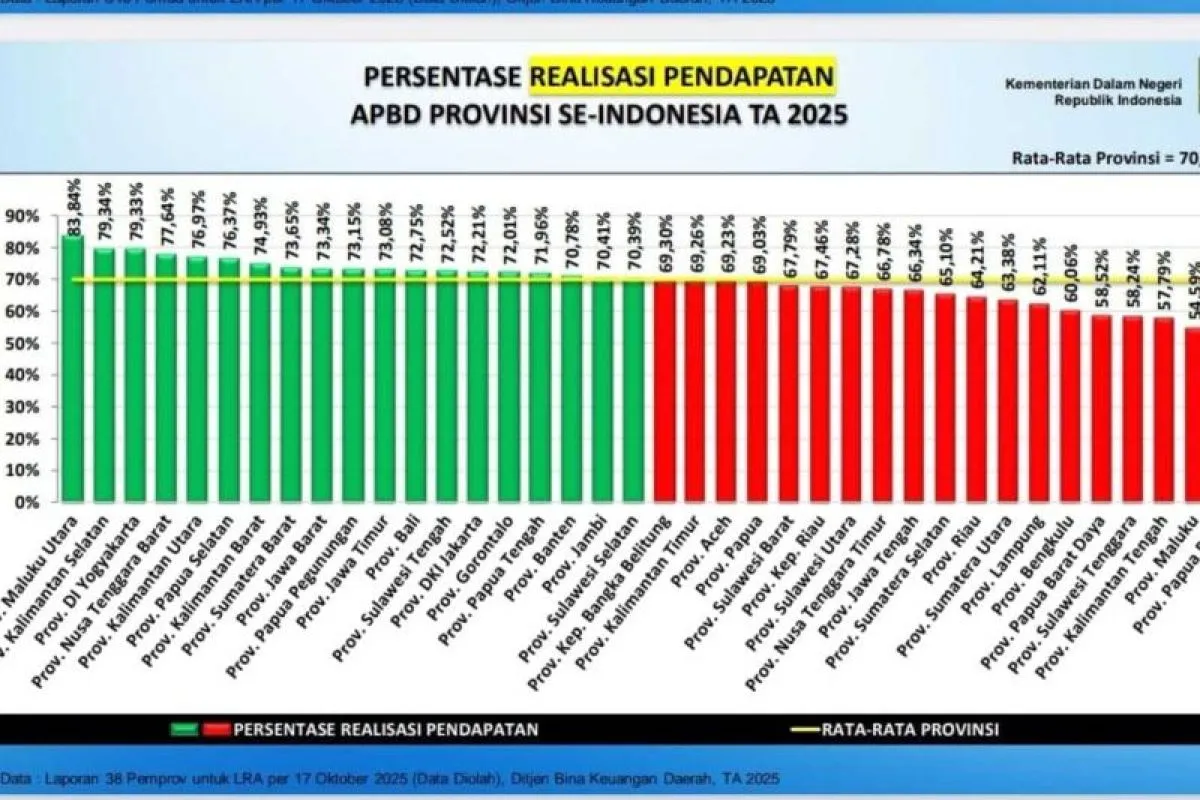 Pemerintah pusat melalui Direktorat Jenderal Bina Keuangan Daerah Kementerian Dalam Negeri mencatat, hingga 17 Oktober 2025, Banten membukukan realisasi pendapatan 70,78 persen dan belanja 57,72 persen.