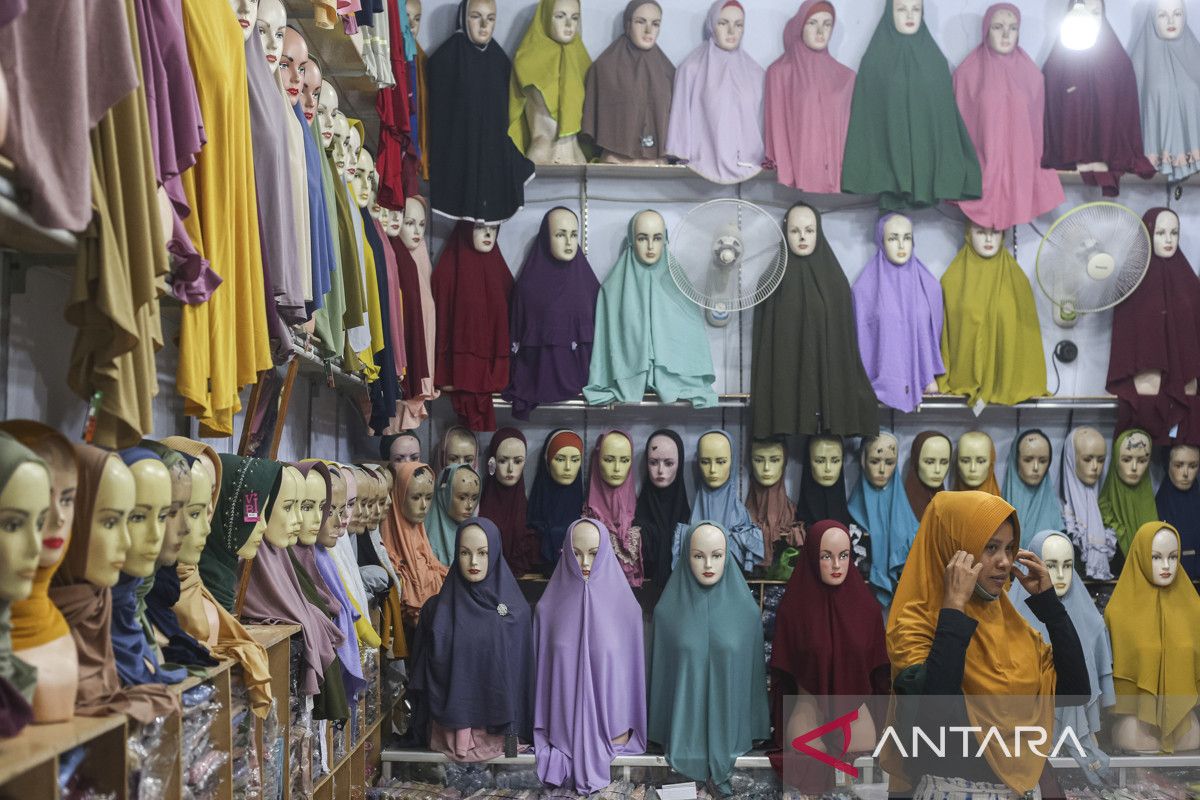 Pembeli mencoba kerudung di Pasar Kranggot, Kota Cilegon, Banten, Rabu (5/11/2025). Badan Pusat Statistik (BPS) Provinsi Banten mencatat pada Oktober 2025 secara tahunan, Banten mengalami inflasi sebesar 2,75 persen dengan Indeks Harga Konsumen (IHK) sebesar 108,51 yang disebabkan adanya kenaikan harga pada sembilan kelompok pengeluaran di antaranya kelompok makanan, minuman, dan tembakau sebesar 4,98 persen serta kelompok pakaian dan alas kaki sebesar 0,95 persen.