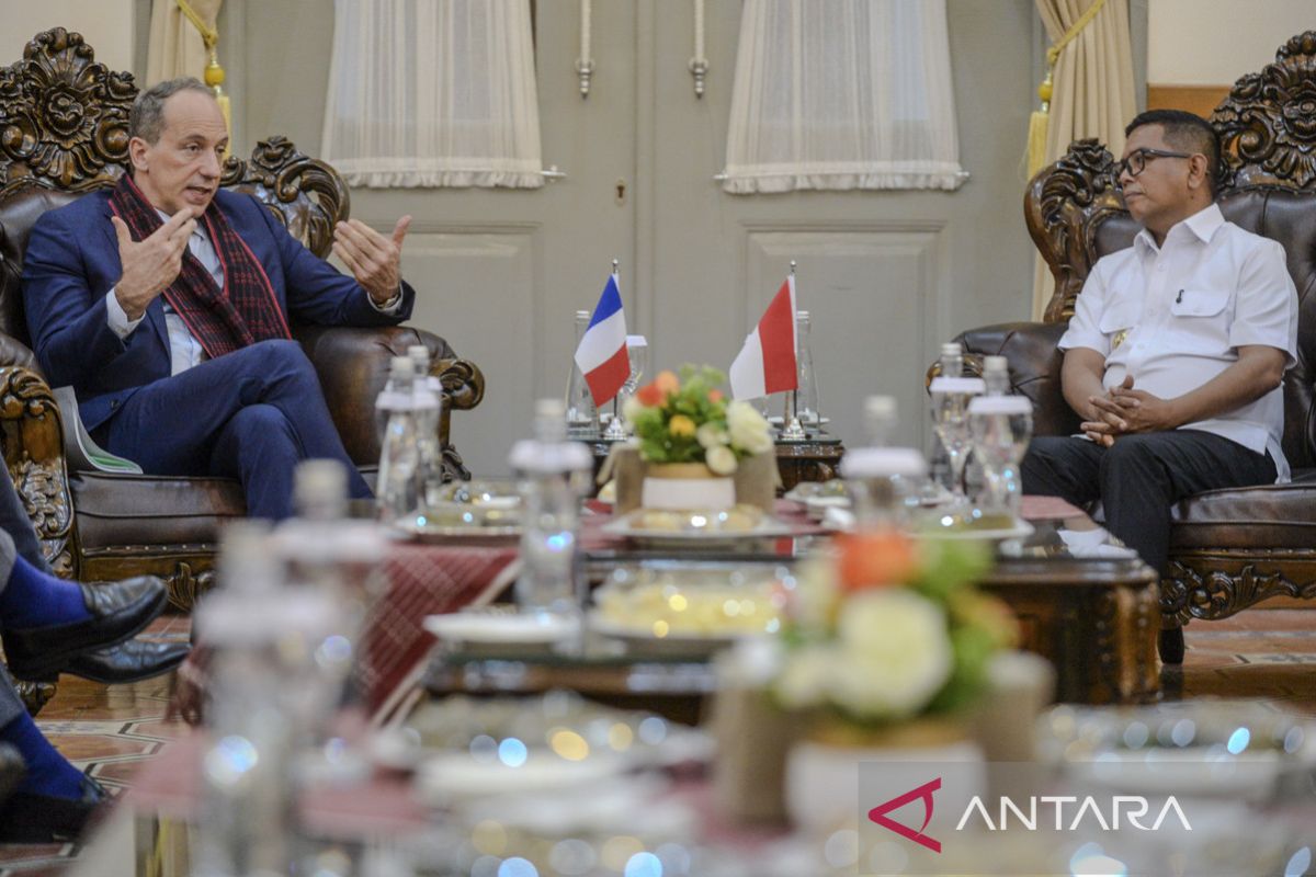 Duta Besar Prancis untuk Indonesia Fabien Panone (kiri) berbincang dengan Gubernur Banten Andra Soni (kanan) di Gedung Negara Provinsi Banten, Kota Serang, Banten, Rabu (12/11/2025). Dalam kunjungan tersebut membahas tentang kerja sama bilateral antara Negara Prancis dan pemerintah daerah di bidang ekonomi khususnya sektor industri pengolahan karet sintetis, pengolahan makanan berbahan jagung, pendidikan vokasi, dan pariwisata.