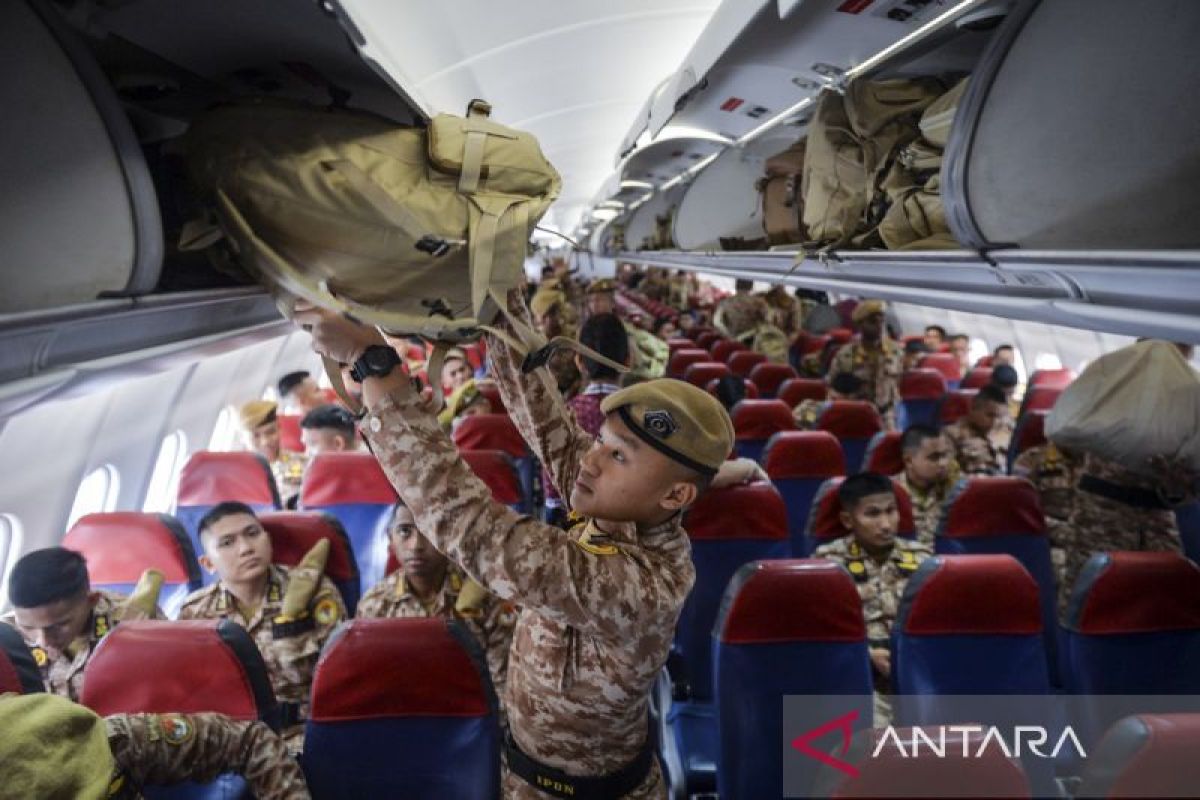 Praja Institut Pemerintahan Dalam Negeri (IPDN) menyimpan tas ke dalam kabin pesawat di Terminal 1 Bandara Soekarno-Hatta, Kota Tangerang, Banten, Sabtu (3/1/2026). Kementerian Dalam Negeri berkolaborasi dengan Lion Air Grup memberangkatkan sebanyak 1.138 praja IPDN ke desa terdampak bencana di Aceh Tamiang dan Aceh Utara, guna mempercepat aktivasi layanan publik pemerintah daerah setempat yang terhambat akibat mengalami kerusakan parah pascabencana.