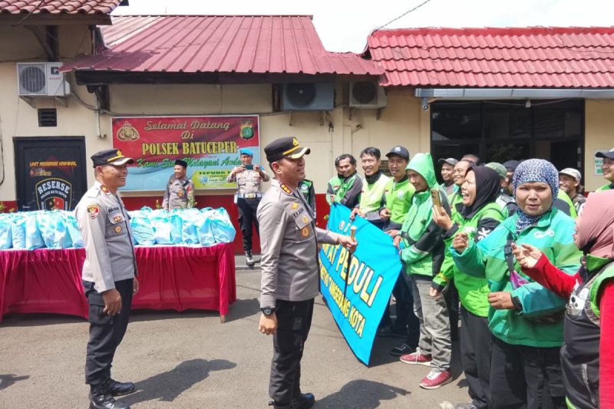 Tangerang (ANTARA) - Polres Metro Tangerang Kota menyalurkan paket sembako kepada 100 orang pengemudi ojek online dalam rangka memperkuat kepedulian sosial serta menjaga stabilitas keamanan dan ketertiban masyarakat.