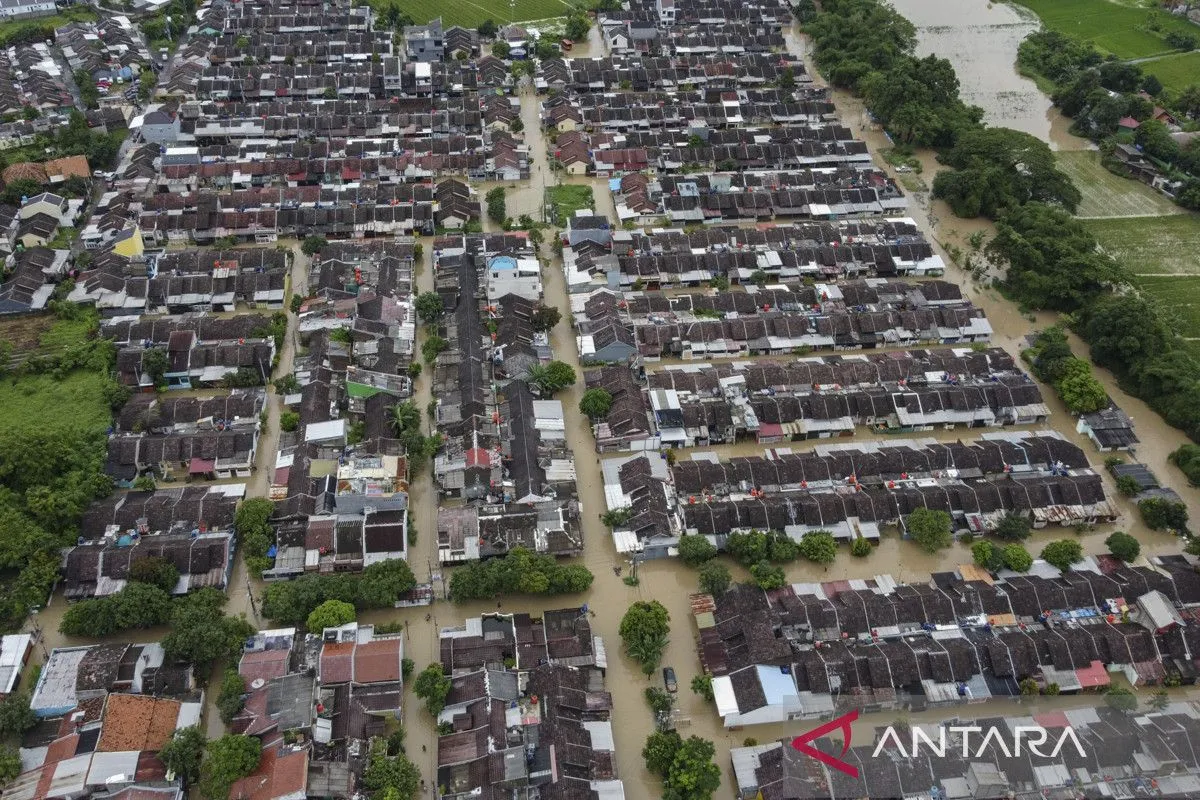 Foto udara kawasan permukiman yang terendam banjir di perumahan Grand Sutera, Kota Serang, Banten, Senin (12/1/2026). Berdasarkan data sementara BPBD Kota Serang per pukul 15.27 WIB, sebanyak 556 rumah terendam banjir dan 1.690 jiwa dari 532 Kepala Keluarga di enam kecamatan terdampak banjir akibat cuaca ekstrem yang melanda wilayah tersebut.