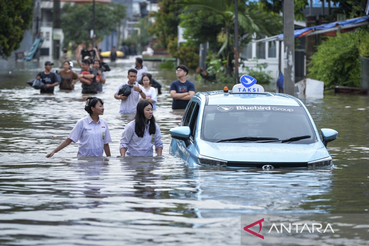 Warga melihat kendaraan taksi yang terjebak banjir di Perumahan Duta Bandara Permai, Kosambi, Kabupaten Tangerang, Banten, Senin (12/1/2026). Badan Penanggulangan Bencana Daerah (BPBD) Kabupaten Tangerang mencatat sebanyak enam wilayah kecamatan terdampak banjir dengan ketinggian mulai dari 30-140 sentimeter yang berdampak terhadap sekitar 1.014 kepala keluarga.