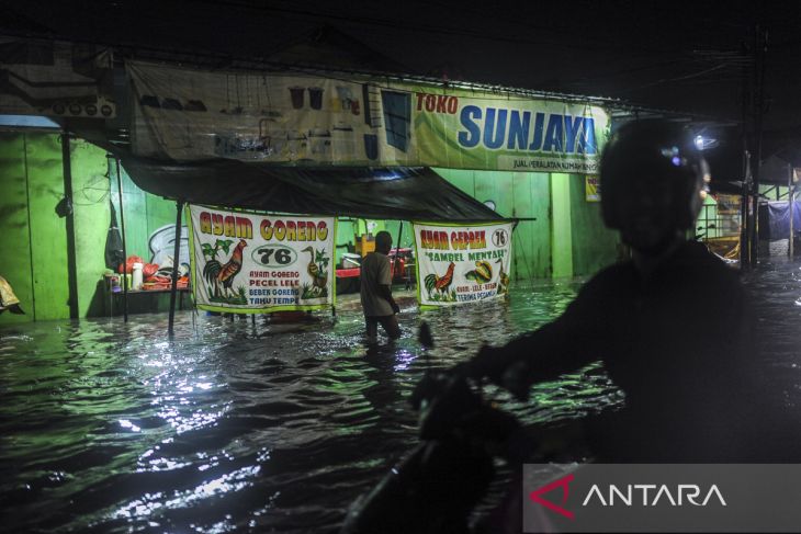 Pengendara roda dua mendorong motornya yang mogok akibat menerjang banjir di Cimanggung, Kota Serang, Banten, Jumat (7/2/2025). Banjir yang merendam jalan raya hingga kawasan pemukiman dengan ketinggian air mencapai 40 sentimeter hingga 120 sentimeter tersebut terjadi akibat tingginya intensitas curah hujan disertai buruknya saluran drainase. ANTARA FOTO/Muhammad Bagus Khoirunas/gp