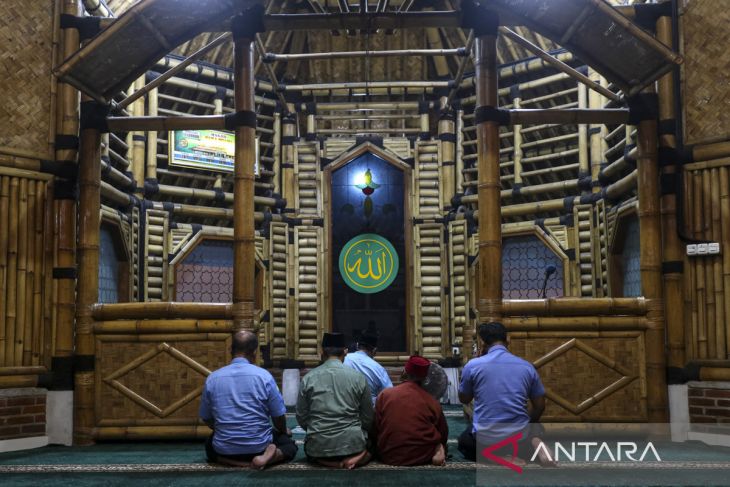 Umat Islam beribadah di Masjid Saka Buana, Kragilan, Kabupaten Serang, Banten, Senin (10/3/2025). Masjid seluas 260 meter persegi dengan 60 persen bahan bangunannya terbuat dari bambu itu dapat menampung hingga 220 orang di dalam ruangan dan total sekitar 390 orang jika ditambah dengan area luar. ANTARA FOTO/Angga Budhiyanto/gp