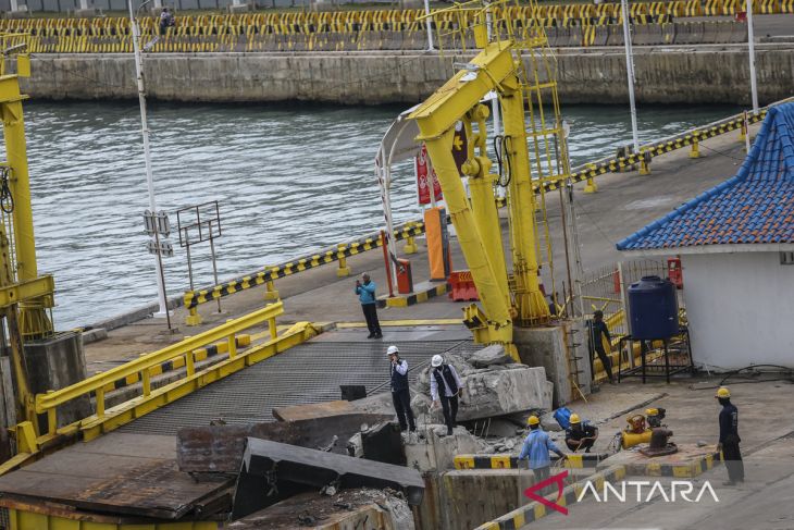 Petugas melihat kondisi jembatan bergerak usai ditabrak KMP Portlink III saat akan bersandar di Dermaga Eksekutif Pelabuhan Merak, Kota Cilegon, Banten, Senin (17/3/2025). Insiden itu mengakibatkan sejumlah bagian pada jembatan bergerak (moveable bridge) di dermaga tersebut mengalami rusak parah sehingga layanan kapal feri ekspres ditutup sementara. ANTARA FOTO/Angga Budhiyanto/gp
