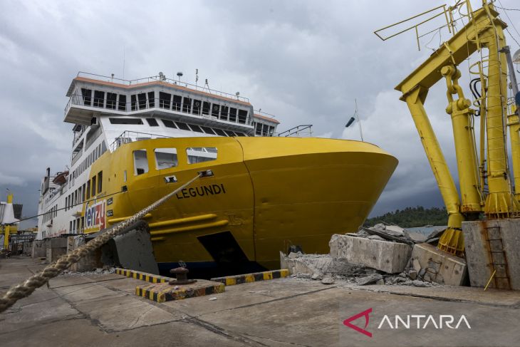 Kondisi jembatan bergerak usai ditabrak KMP Portlink III yang akan bersandar di Dermaga Eksekutif Pelabuhan Merak, Kota Cilegon, Banten, Senin (17/3/2025). Insiden itu mengakibatkan sejumlah bagian pada jembatan bergerak (moveable bridge) di dermaga tersebut mengalami rusak parah sehingga layanan kapal feri ekspres ditutup sementara. ANTARA FOTO/Angga Budhiyanto/gp