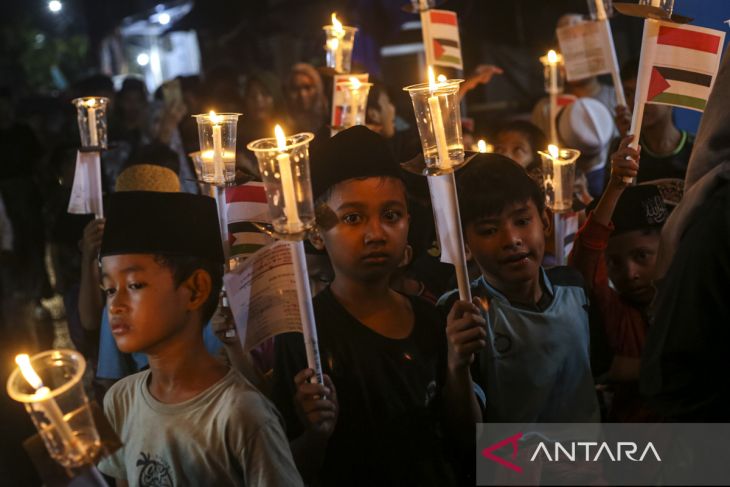 Sejumlah anak membawa lilin mengikuti kirab di Kelurahan Sumur Pecung, Kecamatan Serang, Kota Serang, Banten, Selasa (18/3/2025). Kegiatan yang diikuti ratusan warga dan rutin digelar setiap tahunnya tersebut dalam rangka memperingati Nuzulul Quran 1446 Hijriah. ANTARA FOTO/Angga Budhiyanto/gp