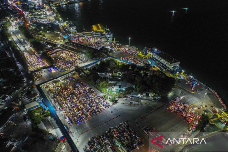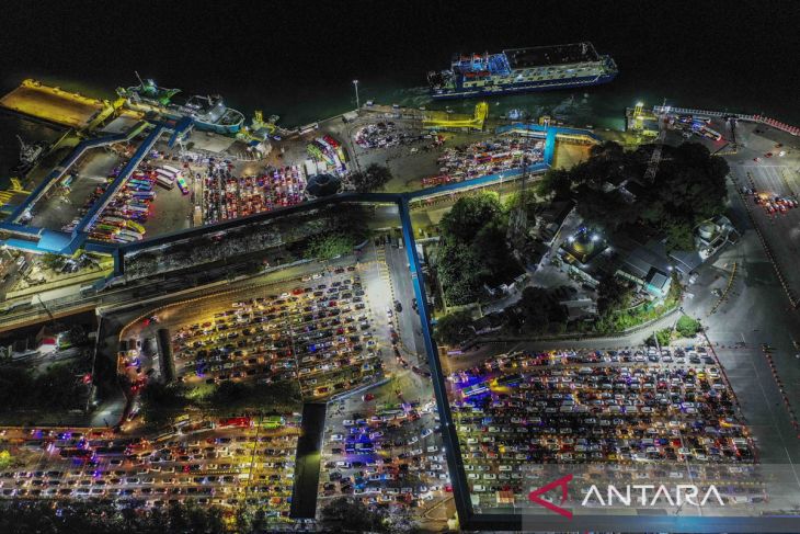 Foto udara sejumlah mobil pemudik antre untuk menaiki kapal di Pelabuhan Merak, Kota Cilegon, Banten, Sabtu (29/3/2025) dini hari. Pada H-2 Lebaran 2025, arus kendaraan di Pelabuhan Merak terpantau ramai. ANTARA FOTO/Galih Pradipta