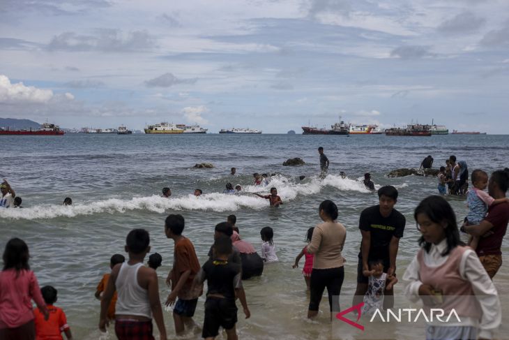 Wisatawan bermain air di Pulau Merak Kecil, Kota Cilegon, Banten, Sabtu (5/4/2025). Objek wisata bahari yang ramai dikunjungi saat libur Lebaran tersebut dapat ditempuh menggunakan perahu motor selama sekitar 10 menit melalui Pantai Mabak, Kota Cilegon dengan tarif pulang-pergi sebesar Rp15 ribu untuk satu orang. ANTARA FOTO/Angga Budhiyanto/gp