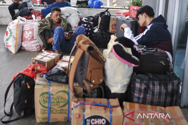 Penumpang membawa barangnya turun dari bus Damri di Terminal Tipe A Pakupatan, Kota Serang, Banten, Minggu (6/4/2025). Berdasarkan data dari posko Terminal Pakupatan pada Sabtu (5/4) jumlah penumpang yang berangkat ke luar Provinsi Banten mencapai sebanyak 9.866 orang dengan total jumlah pergerakan bus mencapai 591 bus. ANTARA FOTO/Muhammad Bagus Khoirunas/gp