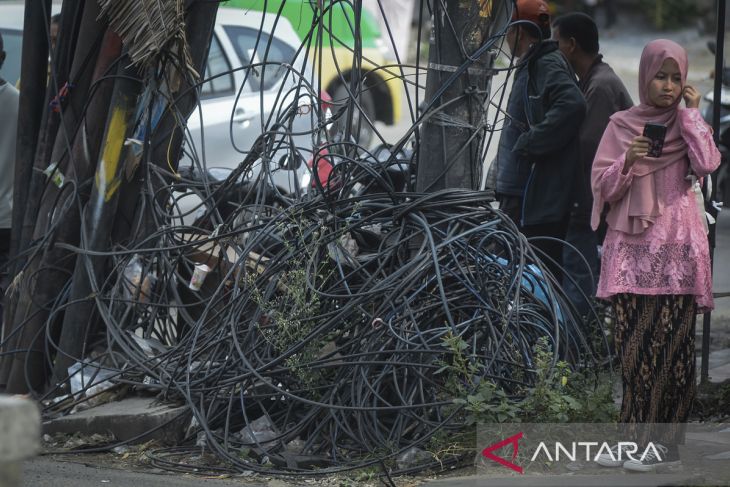 Pengendara sepeda motor melintas di samping kabel utilitas yang semrawut di Jalan Moh. Toha, Kota Tangerang, Banten, Senin (21/4/2025). Kabel utilitas yang tidak terawat hingga menjuntai ke jalan tersebut mengganggu keindahan tata ruang kota dan berpotensi membahayakan pengguna jalan. ANTARA FOTO/Putra M. Akbar/gp