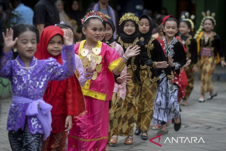 Sejumlah pelajar menyaksikan lomba peragaan busana tradisional saat peringatan Hari Kartini di SDN Sepatan 1, Kabupaten Tangerang, Banten, Senin (21/4/2025). Kegiatan tersebut untuk memperingati jasa pahlawan RA Kartini dalam memperjuangkan emansipasi wanita sekaligus mengenalkan keragaman budaya di Indonesia kepada pelajar. ANTARA FOTO/Putra M. Akbar/gp