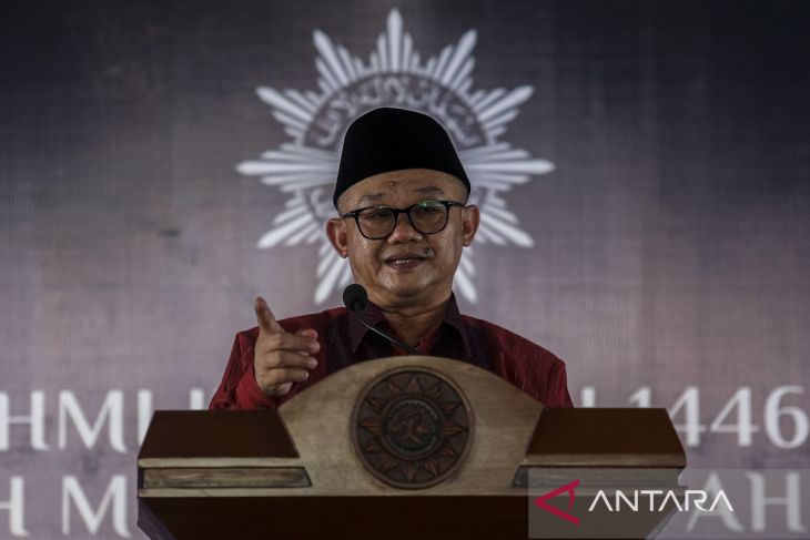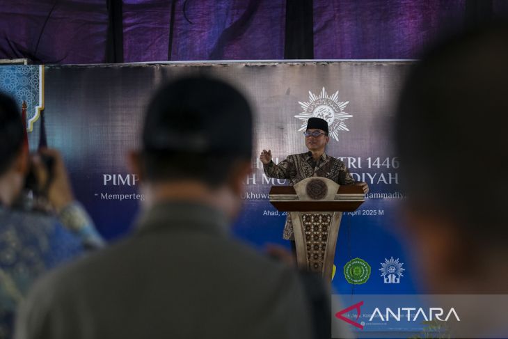 Menteri Pendidikan Dasar dan Menengah yang juga Sekretaris Umum PP Muhammadiyah Abdul Mu'ti menyampaikan sambutan saat acara silaturahmi bersama Pimpinan Wilayah Muhammadiyah Provinsi Banten di Gedung Pusat Dakwah Muhammadiyah Banten, Kota Serang, Banten, Minggu (27/4/2025). Acara silaturahmi Idul Fitri 1446 Hijriah tersebut mengusung tema Memperteguh Ideologi, Sinergi, dan Ukhuwah Islamiyah Menuju Muhammadiyah Berkemajuan dan Umat Sejahtera. ANTARA FOTO/Angga Budhiyanto/gp