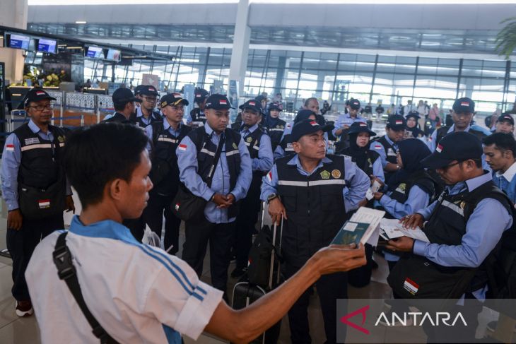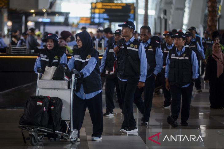 Sejumlah Petugas Penyelenggara Ibadah Haji (PPIH) berjalan setibanya di Terminal 3 Bandara Soekarno-Hatta, Kota Tangerang, Banten, Senin (28/4/2025). Pemerintah memberangkatkan sebanyak 388 orang PPIH Arab Saudi tahun 2025 yang akan bertugas di daerah kerja Madinah dan Bandara. ANTARA FOTO/Putra M. Akbar/gp