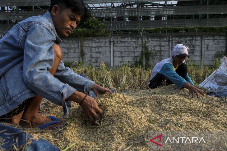 Petani mengumpulkan bulir padi yang telah dirontokkan saat panen di area persawahan di Kramatwatu, Kabupaten Serang, Banten, Rabu (30/4/2025). Menteri Pertanian Andi Amran Sulaiman memperkirakan Indonesia dapat memproduksi beras hingga 34 juta ton sepanjang tahun 2025 atau berada di atas target pemerintah sebelumnya yaitu sebanyak 32 juta ton. ANTARA FOTO/Angga Budhiyanto/gp
