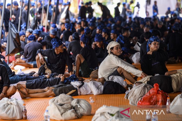 Sejumlah warga Suku Badui duduk beristirahat usai berjalan kaki di Gedung Negara Banten, Kota Serang, Banten, Sabtu (3/5/2025). Tradisi yang berlangsung pada setiap tahun tersebut dilaksanakan dengan penyerahan hasil panen dan penyampaian aspirasi masyarakat Suku Badui kepada pemerintahan. ANTARA FOTO/Muhammad Bagus Khoirunas/gp