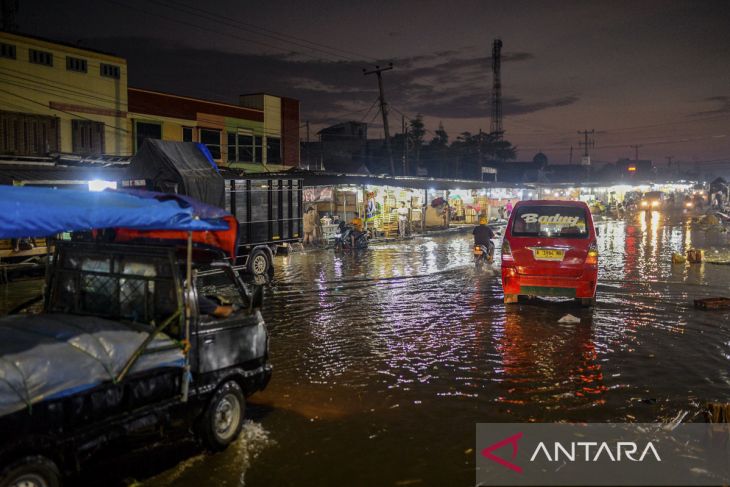 Pengendara roda dua menerobos banjir di Pasar Induk Rau, Kota Serang, Banten, Minggu (4/5/2025). Hujan dengan intensitas tinggi serta saluran drainase yang buruk tersebut mengakibatkan banjir di Pasar Induk Rau hingga setinggi 30-50 sentimeter. ANTARA FOTO/Muhammad Bagus Khoirunas/gp