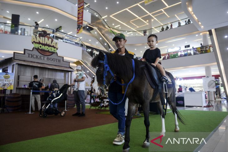 Seorang anak menaiki kuda poni pada Animal Wonders di Mal Ciputra Tangerang, Cikupa, Kabupaten Tangerang, Banten, Selasa (13/5/2025). Pameran yang menghadirkan pertunjukan satwa eksotis, wahana edukatif dan pengalaman berinteraksi langsung dengan hewan tersebut berlangsung hingga 25 Mei 2025. ANTARA FOTO/Putra M. Akbar/gp