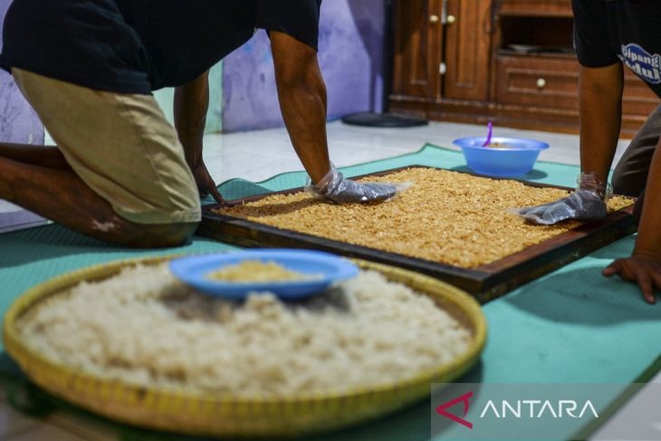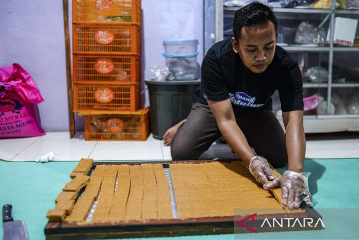Pekerja menunjukkan gipang di rumah produksi Gipang Sadulur, Kelurahan Bulakan, Kota Cilegon, Banten, Rabu (14/5/2025). Penjualan kue tradisional khas Kota Cilegon tersebut telah menembus pasar internasional seperti Jepang dan Malaysia dengan jumlah permintaan sekali kirim mencapai 500 bungkus dan dijual seharga Rp20 ribu hingga Rp30 ribu per bungkus. ANTARA FOTO/Muhammad Bagus Khoirunas/gp