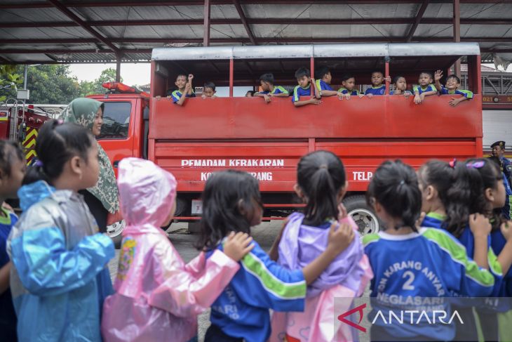 Sejumlah siswa SD antre menaiki mobil pemadaman kebakaran di Kantor Badan Penanggulangan Bencana Daerah Kota Tangerang, Banten, Kamis (15/5/2025). Kegiatan tersebut bertujuan untuk memperkenalkan serta mengedukasi siswa usia dini tentang profesi petugas pemadam kebakaran dan sosialisasi mencegah kebakaran. ANTARA FOTO/Putra M. Akbar/gp