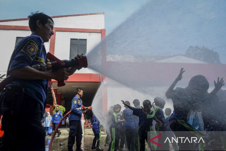 Petugas Damkar menyemprotkan air ke siswa SD saat edukasi pemadaman kebakaran di Kantor Badan Penanggulangan Bencana Daerah Kota Tangerang, Banten, Kamis (15/5/2025). Kegiatan tersebut bertujuan untuk memperkenalkan serta mengedukasi siswa usia dini tentang profesi petugas peamadam kebakaran dan sosialisasi mencegah kebakaran. ANTARA FOTO/Putra M. Akbar/gp
