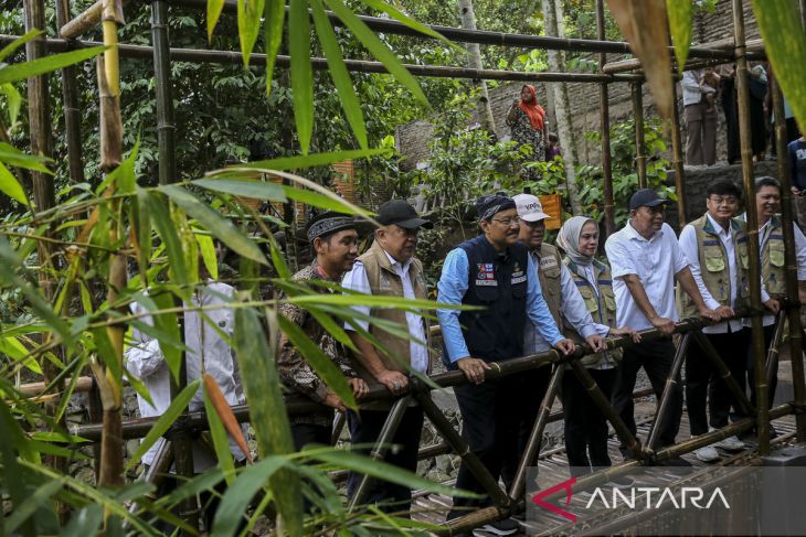 Menteri Sosial Saifullah Yusuf (keempat kiri) didampingi Direktur Jenderal Pemberdayaan Sosial Kementerian Sosial Mira Riyati Kurniasih (keempat kanan) meninjau Taman Firdaus saat kunjungan kerja di Desa Talaga, Mancak, Kabupaten Serang, Banten, Jumat (23/5/2025). Kunjungan Menteri Sosial tersebut untuk meninjau sejumlah fasilitas di kawasan yang kini menjadi model pemberdayaan desa berbasis kolaborasi lintas kementerian dan masyarakat di antaranya balai komunitas, bank sampah, Taman Firdaus, serta Rumah Sejahtera Terpadu (RST). ANTARA FOTO/Angga Budhiyanto/gp