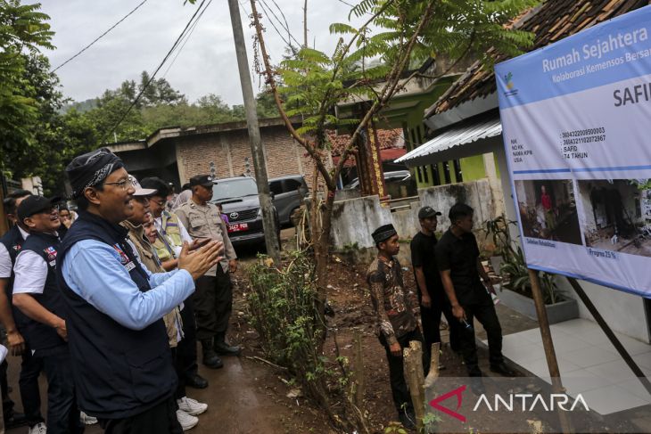 Menteri Sosial Saifullah Yusuf (kedua kiri) meninjau salah satu Rumah Sejahtera Terpadu (RST) saat kunjungan kerja di Desa Talaga, Mancak, Kabupaten Serang, Banten, Jumat (23/5/2025). Kunjungan Menteri Sosial tersebut untuk meninjau sejumlah fasilitas di kawasan yang kini menjadi model pemberdayaan desa berbasis kolaborasi lintas kementerian dan masyarakat di antaranya balai komunitas, bank sampah, Taman Firdaus, serta Rumah Sejahtera Terpadu (RST). ANTARA FOTO/Angga Budhiyanto