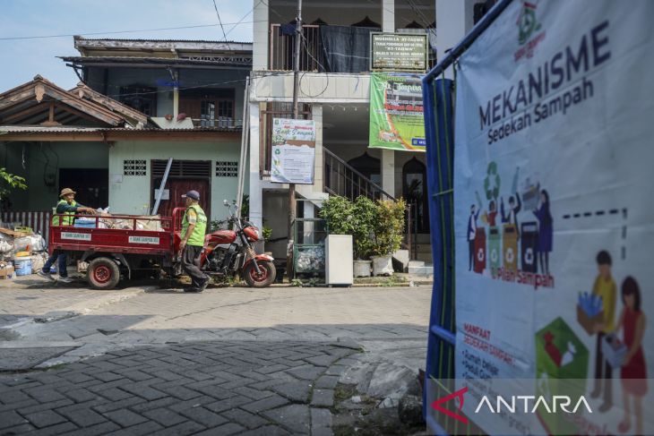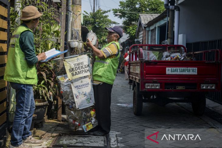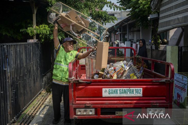 Pengurus Bank Sampah 102 mengangkut sampah anorganik di Cibodas, Kota Tangerang, Banten, Senin (2/6/2025). Kementerian Lingkungan Hidup menargetkan membentuk 83.451 bank sampah baru hingga tahun 2029 untuk mengoptimalkan pengelolaan sampah di tingkat komunitas melalui pemberdayaan masyarakat. ANTARA FOTO/Putra M. Akbar/gp
