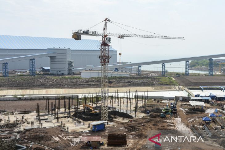 Pekerja menggunakan alat berat menyelesaikan proyek pembangunan PLTU Jawa unit 9-10 di Suralaya, Kota Cilegon, Banten, Selasa (24/6/2025). Direktur Utama PT PLN (Persero) Darmawan Prasodjo menyampaikan bahwa eksekusi Rencana Usaha Penyediaan Tenaga Listrik (RUPTL) PLN 2025â2034 akan berkontribusi terhadap pertumbuhan ekonomi hingga 1,4 persen setiap tahun. ANTARA FOTO/Muhammad Bagus Khoirunas/gp