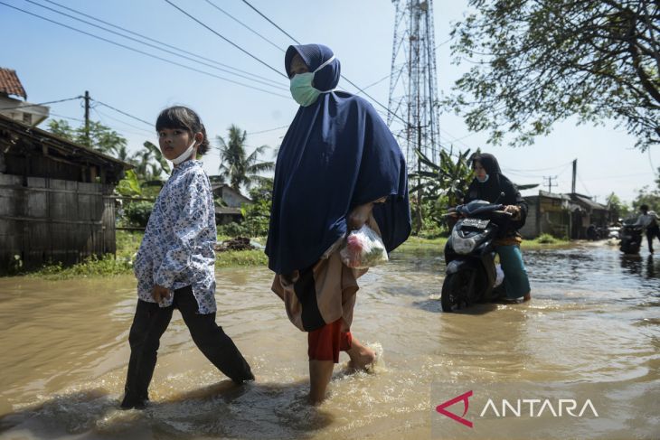Warga melintasi banjir di Desa Gaga, Pakuhaji, Kabupaten Tangerang, Banten, Minggu (6/7/2025). Banjir dengan ketinggian 15 - 30 cm tersebut akibat meluapnya debit Sungai Cisadane yang dipicu air kiriman dari wilayah Bogor dan tingginya curah hujan pada Sabtu (5/7). ANTARA FOTO/Putra M. Akbar/gp