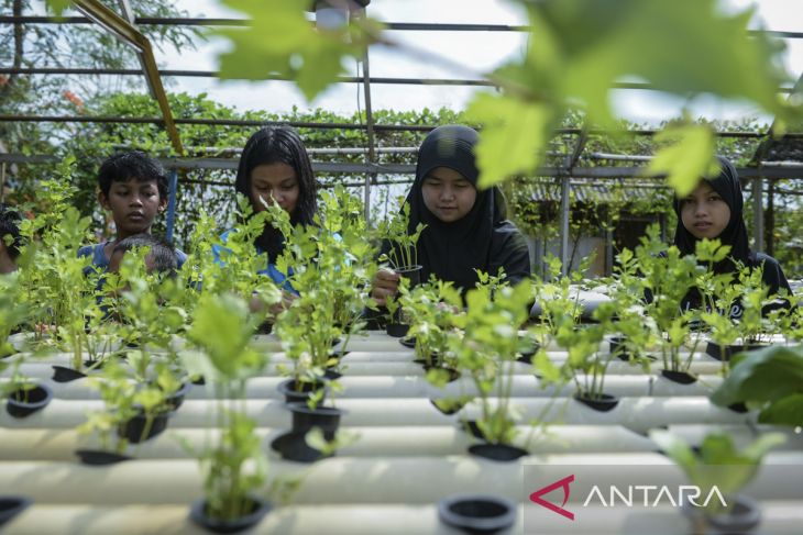 Anak-anak melihat tanaman hidroponik seledri saat edukasi urban farming di KWT Gemas Implan, Jatiuwung, Kota Tangerang, Banten, Rabu (9/7/2025). Kegiatan tersebut untuk mengedukasi anak-anak dalam memahami siklus hidup tanaman dan menumbuhkan kepedulian terhadap pelestarian lingkungan. ANTARA FOTO/Putra M. Akbar/gp