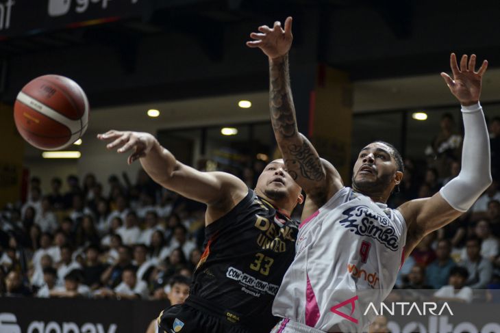 Pebasket Dewa United Banten Lester Prosper (kedua kanan) berebut bola dengan pebasket Rans Simba Bogor Augusto Cesar Lima Brito (kanan) pada gim kedua semifinal Indonesia Basketball League (IBL) 2025 di Dewa United Arena, Kabupaten Tangerang, Banten, Sabtu (12/7/2025). Dewa United Banten dikalahkan Rans Simba Bogor dengan skor akhir 89-95. ANTARA FOTO/Putra M. Akbar/gp