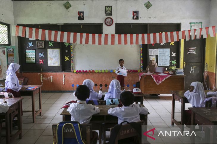 Murid kelas satu mengikuti kegiatan belajar mengajar di salah satu ruang kelas di SD Negeri Karaton 5, Kabupaten Pandeglang, Banten, Senin (14/7/2025). Pihak sekolah menuturkan, SDN yang sempat terancam ditutup karena kekurangan murid tersebut saat ini hanya memiliki total murid sebanyak 37 orang dari seluruh tingkat yang menempati tiga ruang kelas dengan tenaga pendidik sebanyak lima orang. ANTARA FOTO/Angga Budhiyanto/gp