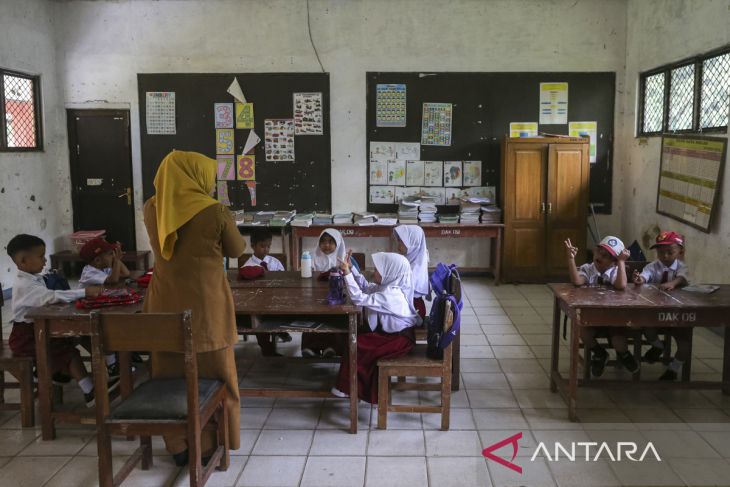 Murid kelas satu dan dua mengikuti kegiatan belajar mengajar di salah satu ruang kelas di SD Negeri Karaton 5, Kabupaten Pandeglang, Banten, Senin (14/7/2025). Pihak sekolah menuturkan, SDN yang sempat terancam ditutup karena kekurangan murid tersebut saat ini hanya memiliki total murid sebanyak 37 orang dari seluruh tingkat yang menempati tiga ruang kelas dengan tenaga pendidik sebanyak lima orang. ANTARA FOTO/Angga Budhiyanto/gp