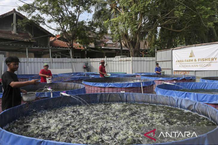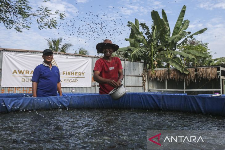 Pekerja memberi pakan ikan lele di kolam budi daya bioflok mitra binaan Koperasi Kelurahan Merah Putih (KKMP) Kotabumi, Kecamatan Purwakarta, Kota Cilegon, Banten, Kamis (31/7/2025). Pemerintah menerbitkan peraturan baru tentang tata cara pinjaman untuk mendanai Koperasi Desa/Kelurahan Merah Putih sebagaimana tertuang dalam Peraturan Menteri Keuangan (PMK) Nomor 49 Tahun 2025 tentang Tata Cara Pinjaman dalam Rangka Pendanaan Koperasi Desa/Kelurahan Merah Putih, di mana melalui peraturan itu Koperasi Merah Putih bisa mengakses pinjaman hingga Rp3 miliar dari bank himbara dengan bunga tetap sebesar enam persen per tahun, tenor enam tahun, dan masa tenggang enam hingga delapan bulan. ANTARA FOTO/Angga Budhiyanto/gp
