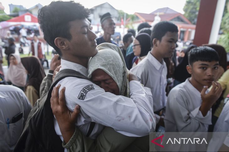 Siswa memeluk ibunya sebelum memasuki asrama usai peresmian Sekolah Rakyat Menengah Atas (SRMA) 33 Tangerang Selatan di Jelupang, Kota Tangerang Selatan, Banten, Jumat (15/8/2025). Sebanyak 150 siswa jenjang SMA dari tujuh kabupaten dan kota di Provinsi Banten mulai memasuki arama dan menjalani masa pengenalan lingkungan sekolah (MPLS) tahun ajaran 2025/2026. ANTARA FOTO/Putra M. Akbar/gp