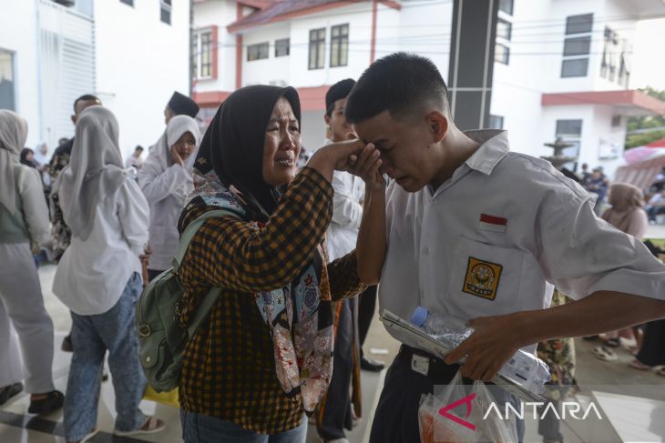 Siswa menyalami ibunya sebelum memasuki asrama usai peresmian Sekolah Rakyat Menengah Atas (SRMA) 33 Tangerang Selatan di Jelupang, Kota Tangerang Selatan, Banten, Jumat (15/8/2025). Sebanyak 150 siswa jenjang SMA dari tujuh kabupaten dan kota di Provinsi Banten mulai memasuki arama dan menjalani masa pengenalan lingkungan sekolah (MPLS) tahun ajaran 2025/2026. ANTARA FOTO/Putra M. Akbar/gp