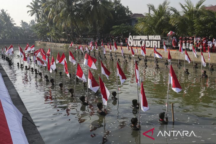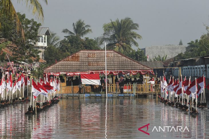 Warga membawa bendera Merah Putih selama prosesi upacara pengibaran bendera di Kanal Surosowan, Kampung Wisata Sukadiri, Kasemen, Kota Serang, Banten, Minggu (17/8/2025). Upacara yang digelar dengan mengibarkan sebanyak 80 bendera Merah Putih dan diikuti oleh ratusan warga tersebut untuk memperingati HUT ke-80 Kemerdekaan Republik Indonesia, sekaligus mempromosikan potensi wisata di Kampung Wisata Sukadiri. ANTARA FOTO/Angga Budhiyanto/gp