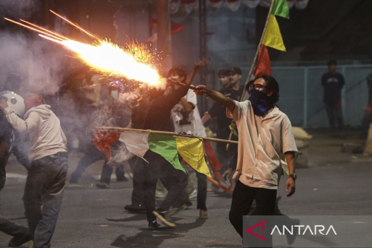 Pengunjuk rasa menembakkan kembang api ke arah polisi di Kota Serang, Banten, Sabtu (30/8/2025). Aksi mengecam tindakan represif polisi kepada masyarakat sipil dan menuntut dibatalkanya kenaikan tunjangan anggota DPR tersebut berakhir ricuh. ANTARA FOTO/Angga Budhiyanto/gp