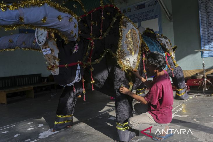 Warga memeriksa rangka Panjang Mulud berbentuk hewan di Kampung Pekijing, Taktakan, Kota Serang, Banten, Rabu (3/9/2025). Warga menjual rangka Panjang Mulud beragam bentuk yang sebelumnya diarak saat perayaan Maulid Nabi Muhammad SAW dengan kisaran harga Rp250 ribu-Rp500 ribu dan hasil penjualannya digunakan untuk perayaan tahun selanjutnya serta diserahkan untuk kas masjid. ANTARA FOTO/Angga Budhiyanto/gp