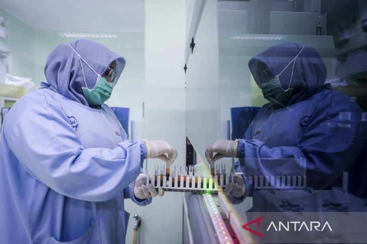 Petugas memasukkan sampel darah ke dalam mesin pengecek golongan darah sebelum dilakukan pemisahan sel di Unit Pengelola Darah PMI Kota Tangerang, Banten, Kamis (11/9/2025). PMI Kota Tangerang mengirim 875 liter plasma darah setiap bulannya untuk dilakukan fraksionasi atau pemisahan komponen plasma darah ke Korea Selatan dan akan dikembalikan lagi ke Indonesia dalam bentuk bahan baku obat-obatan seperti albumin, faktor koagulasi dan imunoglobulin. ANTARA FOTO/Putra M. Akbar/gp